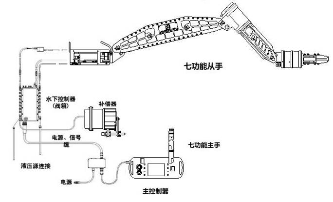 该机械手系统由主控制器(含主操作手)、水下阀箱及从手组成,开展水下作业时操作主手,从手追随主手动作。从手可执行肩部摆动、肩部俯仰、肘部俯仰、肘部摆动、腕部摆动、腕部转动和夹钳开合7个动作,设计水深是7000米,最大伸长范围为1.9米,全臂展最大持重达65公斤。