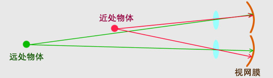 我们通常所说的“立体感”靠一只眼睛是完成不了的,至少需要两只眼睛。当我们注视到某个物体时,我们两只眼睛的视线会自然而然的交叉于一点(斗鸡眼除外),这一个点有个很通俗的名字——“注视点”,从注视点反射回到视网膜上的光点是对应的(就像下面这两幅图片示意的一样)。
