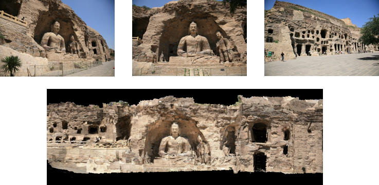 通过这些步骤我们就可以把简单的二维图像影射成一个三维立体的像(就像下面这幅图像一样,利用上边三幅图片建立了下边的三维立体像,我们可以拖动这幅图像从各个角度来观察图像中的这尊石佛)。