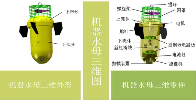 机器水母仿照水母结构分为上下两部分,依靠上部分的螺旋桨产生推力,依靠下部分中的丝杠结构调节姿态来改变其航向。其总高度为341mm,圆柱外壳直径为150mm,最宽距离为254mm,总体重量为3kg左右。它的主要特点是结构简单、造价低廉、便于携带。机器水母的外形及内部结构如图4所示。