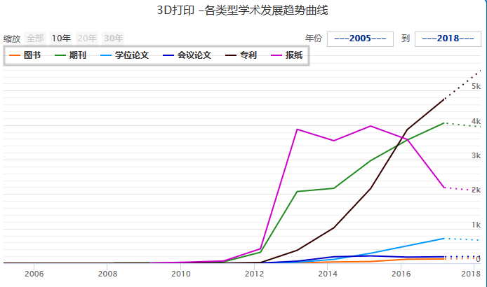 那时候的我,跟现在的人工智能一样,被广泛关注,甚至有人认为,万物皆可3D打印,如图1,有关于我的报道(图1紫色线条)在2012-2014年间呈井喷式增长,随后学术界开始关注起我来了,与我相关的期刊(图1绿色线条)也不断增长,这可是超星发现系统里的数据,绝不掺假,充分的说明咱当年也是火过的,但是,随着时间的推移,社会媒体和公众关注的技术热点也在不断转移,我就渐渐的淡出了公共的视野,这并不代表我从此消失,而是意味着我已经从网红的角色,演变成真正为人类服务的工具。