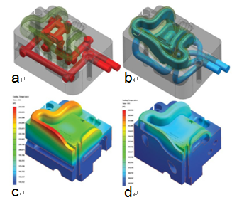 在模具制造方面,因为模具制造大多是把金属或者塑料融化后有一定的压力注入模具中,然后需要把注入的液体快速冷却,水冷当然是最经济好用的办法,然而需要在模具内部加装复杂流道,这种事情对于传统加工技术来说很棘手,对于我来说却轻而易举,如图5,对于传统加工技术的制造的模具水冷流道只能在一个水平面或者直上直下,并不能很全面的冷却工件,从图5(c)中可以看出成形零件的上部温度较高,而由我制造的模具,具有三维立体水冷系统,整个成型零件的温度都比较低,这就是我的厉害之处,所以现在我也被广泛应用于模具制造行业。