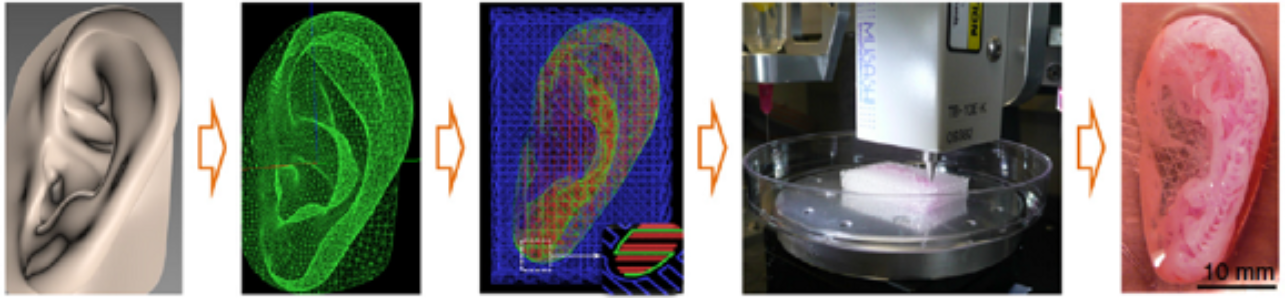 当然,还有让我感到最最自豪的一个领域,就是生物3D打印。从小往大了说吧,首先,我能打印骨骼支架,用于代替钛合金支架,那么我的优势在哪呢?我可以在人体内降解或者与人的骨骼融为一体,而不需要像钛合金支架那样需要再做一次手术把它取出来,这就为病人省了不少的事。其次,我能打印血管之类的形状复杂的结构,用于治疗心血管疾病。最后,我能以生物细胞为原料,打印生物器官,直接解决了医疗器官不足,而且,既降低了成本,还避免了一些工程伦理问题,如图7所示,当我想要打印一个耳朵时,先对耳朵的形状进行逆向三维建模,然后分层,然后以宿主自身的干细胞作为原料进行打印,最后培养成型,这样一个3D打印的耳朵就出来。虽然生物3D打印听上去很厉害,但是我在这方面也只是个新手,还需要更多的研究才能使我真正应用于实际意料中,敬请期待。