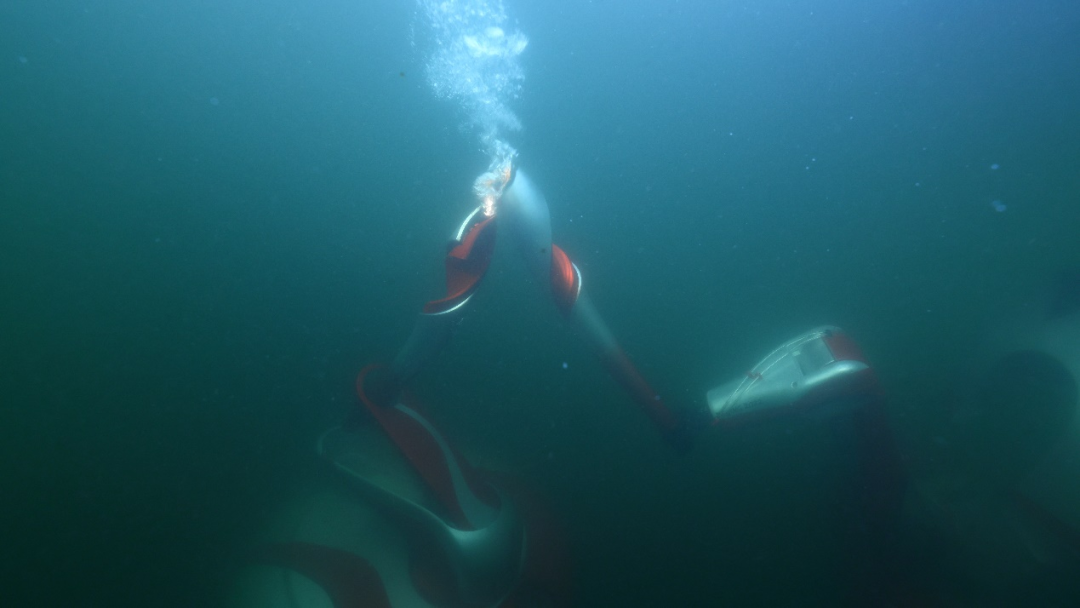 伴随机械臂的舞动,两栖机器人一路旋转,在冰壶赛道上以优美的运动曲线展示科技之美,到达黄色圆垒沿斜面进入冰洞。研发团队通过两栖机器人多运动模式控制,完成不同运动模式的流畅切换。两栖机器人入水后在水面调整位置、姿态,开启水下火焰模式后,垂直下潜到指定位置,稳定悬停定位,等待与水下变结构机器人的火炬对接。