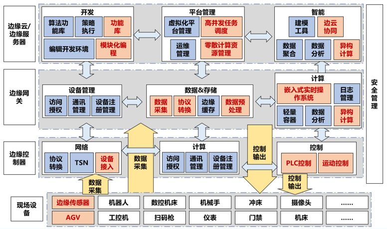 该框架包括了现场设备、边缘控制器、边缘网关、边缘云和边缘服务器。在该框架下,边缘控制能力主要体现在边缘端对现场层设备的控制能力,包括传统离散行业的逻辑控制、PID控制、批量控制、复杂控制、联锁控制和运动控制等;边缘网络能力包括了数据采集、协议转换、5G网络、TSN和专业系统联通等;数据采集和协议转换是边缘端的基本能力,边缘端通过有线或无线方式与现场层设备、传感器、执行器建立物理连接后,通过边缘端支持的多种总线协议和工业以太网协议进行大批量数据的实时采集。同时,通过边缘端的协议解析能力,将采集数据进行过滤、映射或转换等处理,再通过OPC UA或MQTT等协议北向传输处理过的数据。在该框架下,各层之间可以根据任务的计算复杂度和实时性需求进行不同程度上的协作计算,从而满足系统的确定性和实时性等方面的需求。