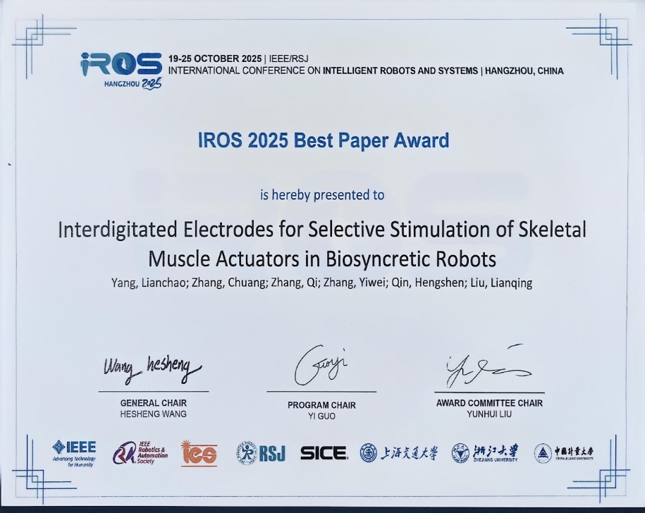 近日,2025年智能机器人与系统国际会议(IEEE IROS 2025)在杭州举行,本次会议共有来自多个国家的科研院所超5000篇论文投稿,逾8000名学者参会。机器人学研究室微纳米课题组博士研究生杨连超等撰写的论文Interdigitated Electrodes for Selective Stimulation of Skeletal Muscle Actuators in Bio-syncretic Robots获得了大会唯一的“最佳会议论文奖”。