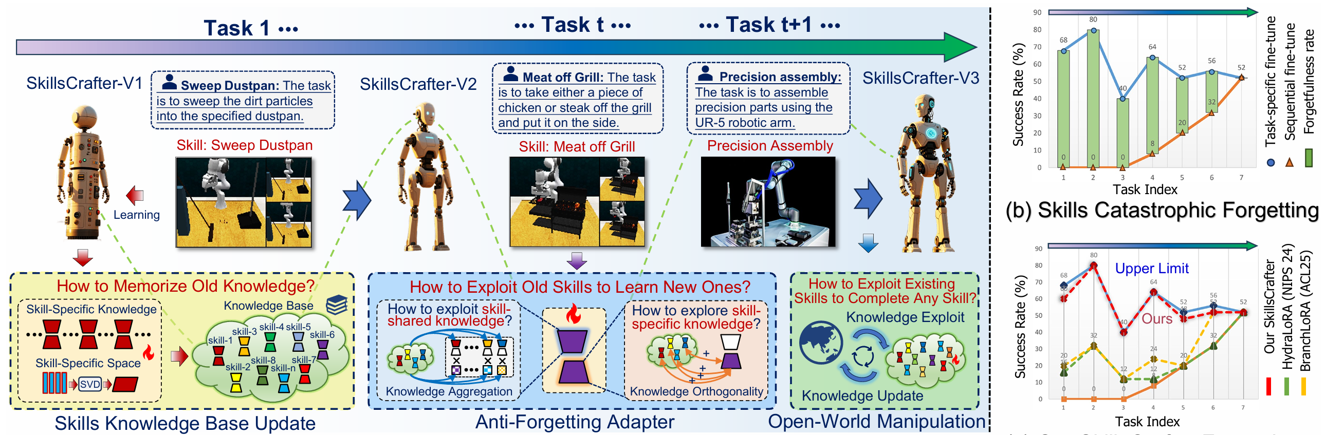 在具身智能操作方面,研究团队提出了一种仿人知识总结与继承的终身学习框架,赋予智能操作机器人持续演进、不断适应新技能的终身学习能力。相关研究成果论文为Lifelong Language-Conditioned Robotic Manipulation Learning,第一作者为博士生王旭东与沈阳自动化所实习生韩泽斌,通讯作者为韩志研究员。