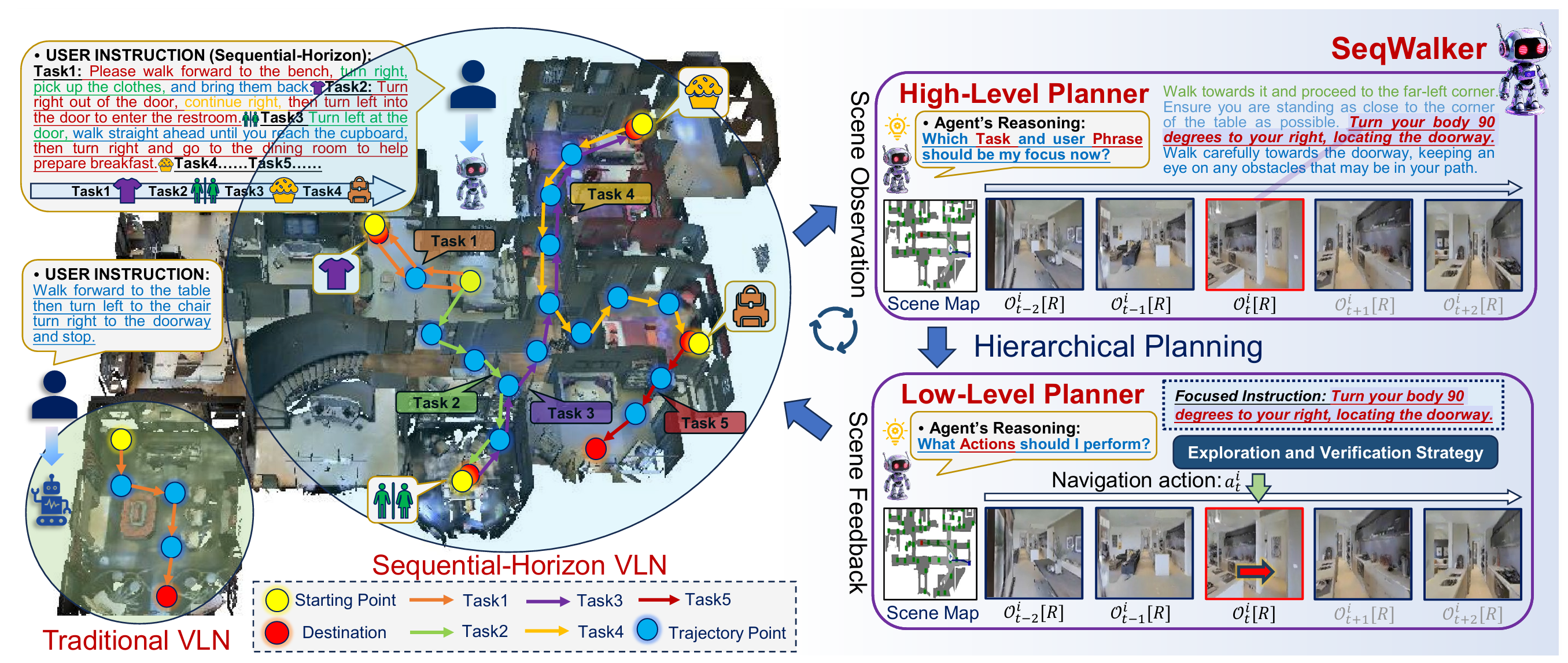 在具身智能导航方面,研究团队提出了一种基于分层规划策略的导航智能体,可提升智能机器人在复杂大场景中具身导航的鲁棒性。相关研究成果论文为SeqWalker: Sequential-Horizon Vision-and-Language Navigation with Hierarchical Planning,第一作者为沈阳自动化所实习生、中北大学本科生韩泽斌,通讯作者为博士生王旭东。