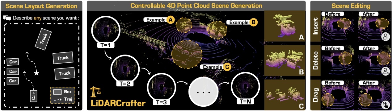 在生成式世界模型方面,研究团队提出了首个可用自然语言控制的 4D LiDAR 生成模型,实现了高逼真、可编辑的动态点云场景生成,可用于多种下游感知模型的安全验证和闭环仿真。该研究成果LiDARCrafter: Dynamic 4D World Modeling from LiDAR Sequences被大会选为口头汇报(Oral)论文,第一作者为博士生梁奥,通讯作者为赵怀慈研究员。