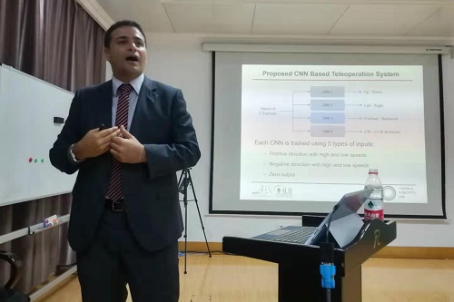 Imad H. Elhajj教授围绕贝鲁特美国大学视觉与机器人实验室在空中、地面和水下机器人方面的研究工作,重点介绍了人类、机器人和网络之间的关系,深入探讨机器人如何更好地理解人类的指令,人类如何能更好地与机器人交互,以及机器人和人类怎样才能更好地联系起来。会上Imad H. Elhajj教授与参会人员进行了深入的讨论。会后Imad H. Elhajj教授参观了机器人学研究室,并与科研人员及研究生进行了现场交流。