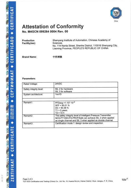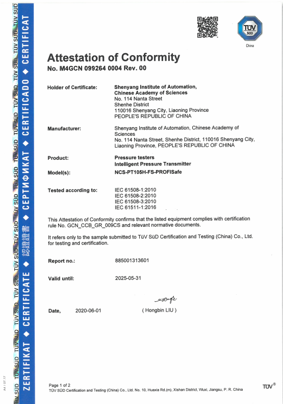 近日,中国科学院沈阳自动化研究所获得了国际认证机构TüV (南德意志大中华集团)颁发的总线型智能压力变送器SIL2/3功能安全认证证书,这是我国首张总线型压力变送器安全认证证书。此前,沈阳自动化所获得了该机构颁发的智能温度变送器SIL2/3功能安全认证证书。