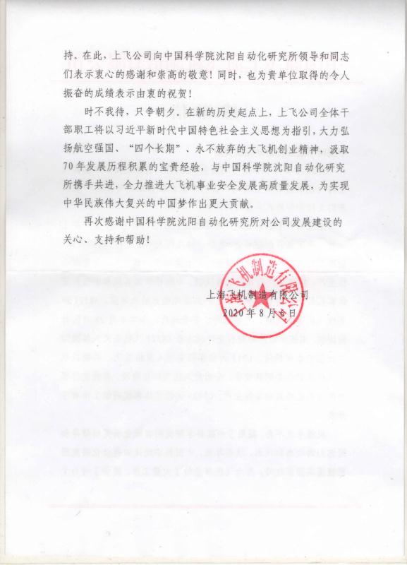 近日,正值中国商飞上海飞机制造有限公司(以下简称上飞公司)成立70周年,上飞公司给中国科学院沈阳自动化研究所发来感谢信,向研究所一直以来的支持和帮助表示感谢。