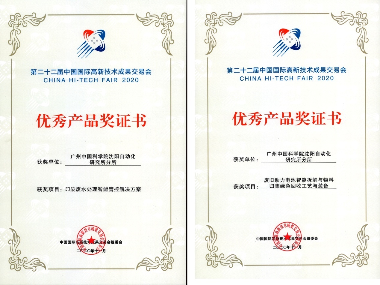 11月11日至15日,广州中国科学院沈阳自动化研究所分所(以下简称“广州分所”)携“印染废水处理智能管控解决方案”“废旧动力电池智能拆解与物料归集绿色回收工艺与装备”亮相第二十二届中国国际高新技术成果交易会(以下简称“高交会”),受到了与会领导、来宾及媒体的广泛关注,两项参展成果均荣获高交会优秀产品奖。