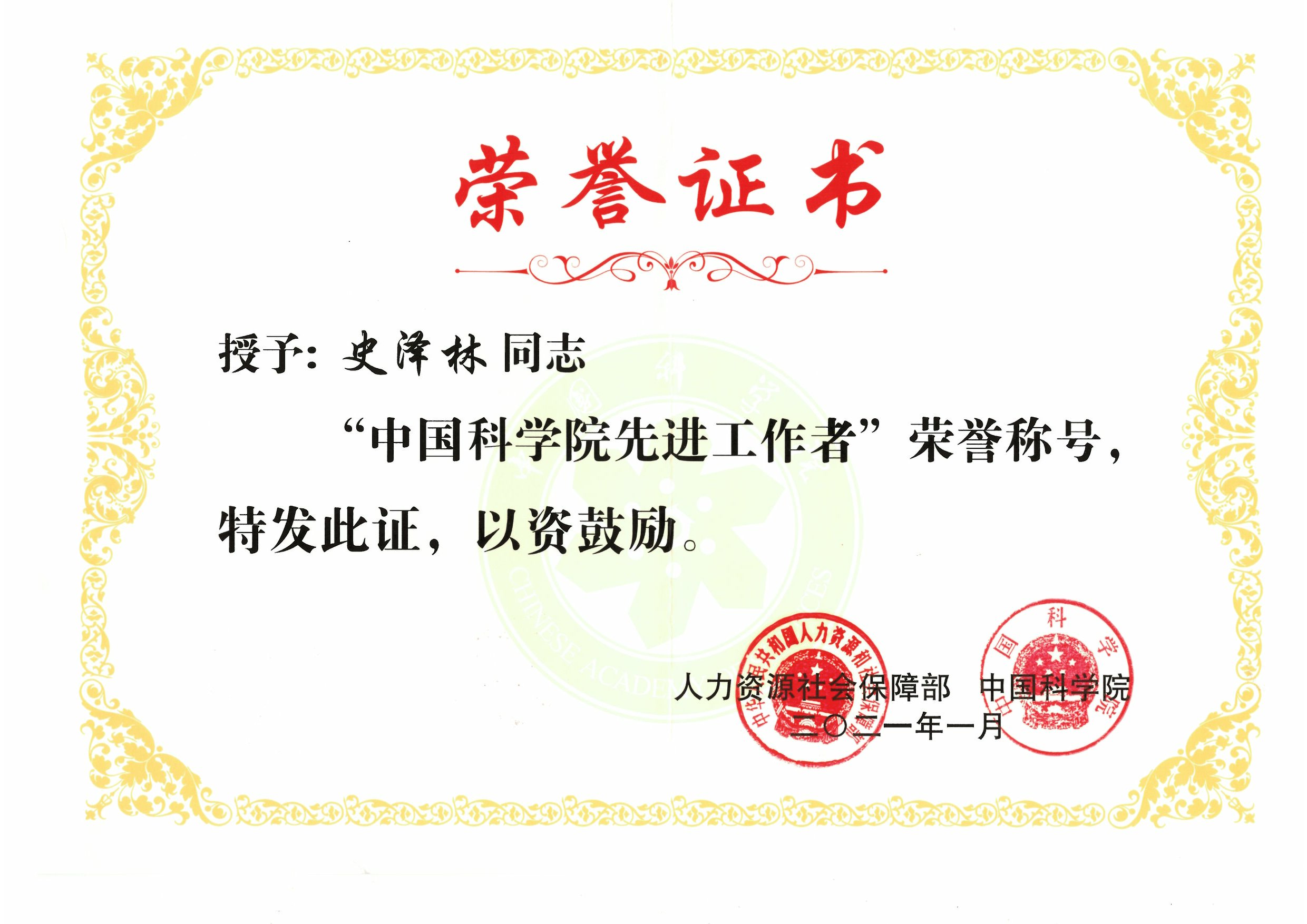 史泽林获评中国科学院先进工作者