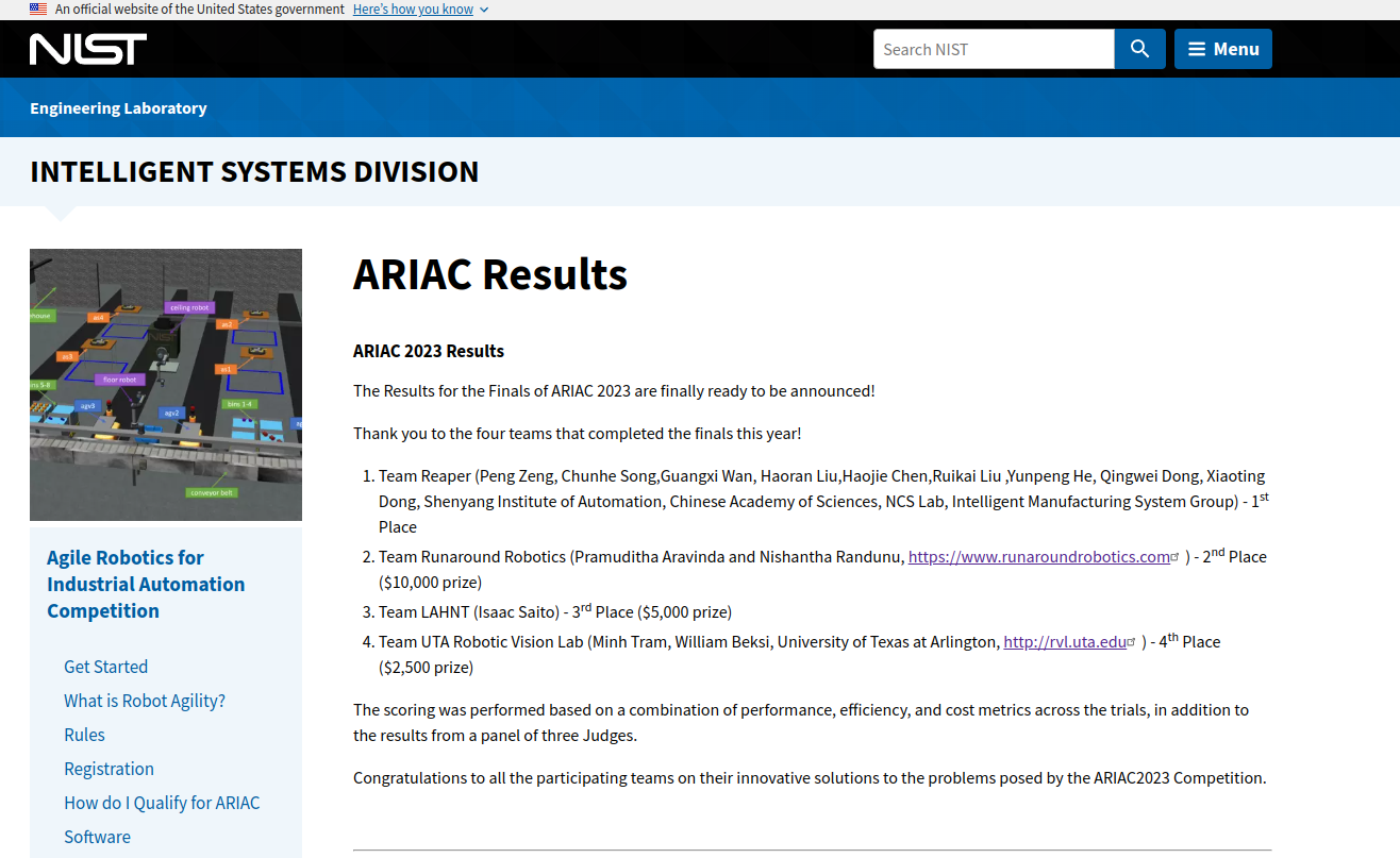 NIST是美国从事物理、生物和工程方面的基础和应用研究,以及测量技术和测试方法研究的国家科研机构,其组织的语音识别OPENASR、人脸识别FRVT等国际比赛享有工程技术前沿科技领域“世界杯”的盛誉。ARIAC是NIST在工业4.0、工业互联网等新一轮工业革命浪潮下,推动人工智能驱动的可重构柔性自动化系统“Smart Automation”发展而组织的国际竞赛。该赛事自2017年开始已举办7届,吸引了100余支来自加州大学、多伦多大学、筑波大学等知名高校、研究机构和高科技企业的团队参赛,沈阳自动化所Reaper团队自参加该项竞赛以来,连续三年获得冠军。(工业控制网络与系统研究室)