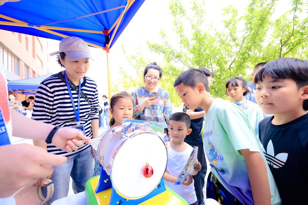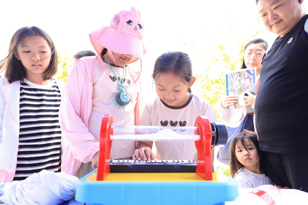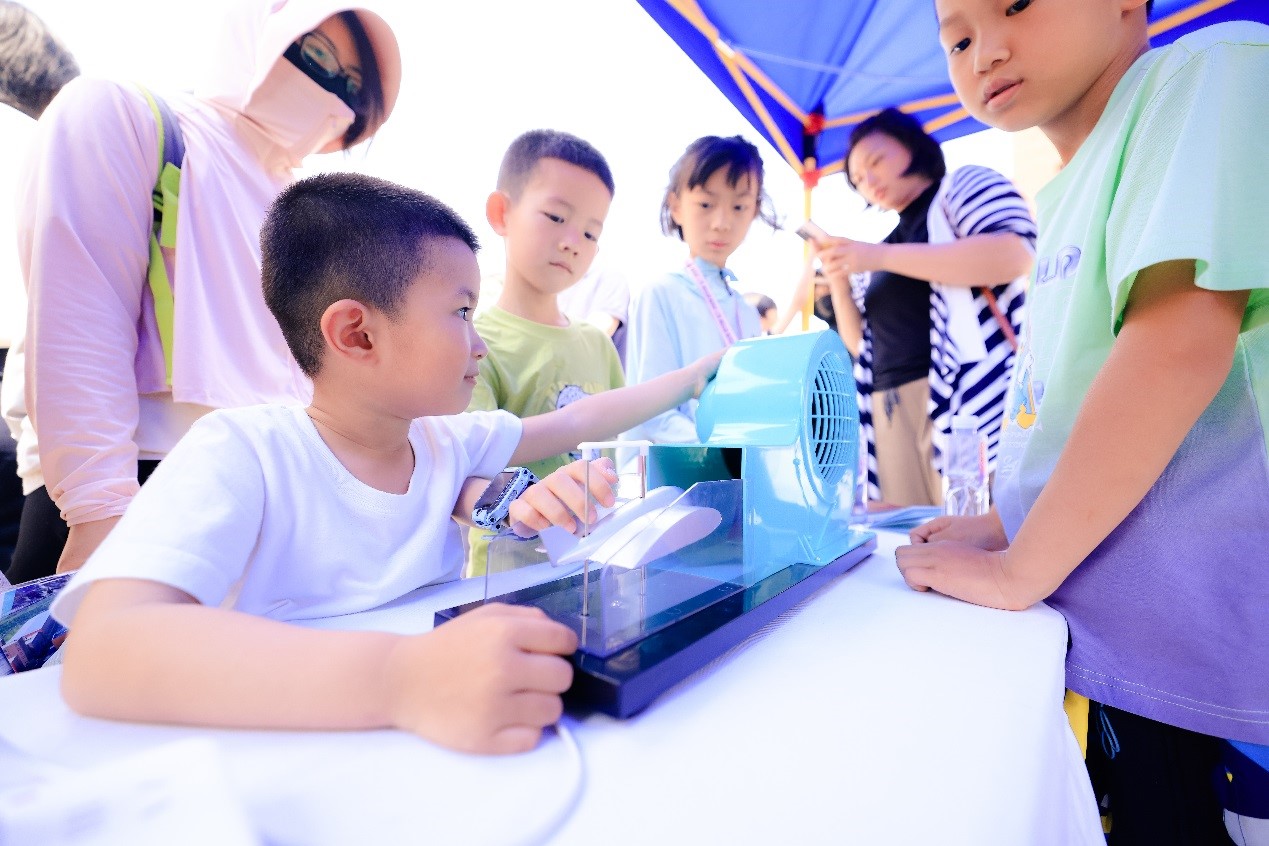 在科学市集,设置了“探索伯努利原理”“仿生爬岩鳅吸爬运动的吸附机器人”“探测声压试验”和“声音共振原理”四个操作演示。小朋友们在志愿者的带领下,通过操作试验道具,沉浸式体验和学习力学、声学等基础科学知识,启发对科学的热爱。