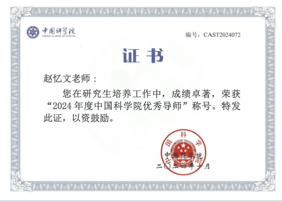 中国科学院沈阳自动化研究所博士生导师赵忆文研究员荣获2024年度“中国科学院优秀导师”荣誉称号。